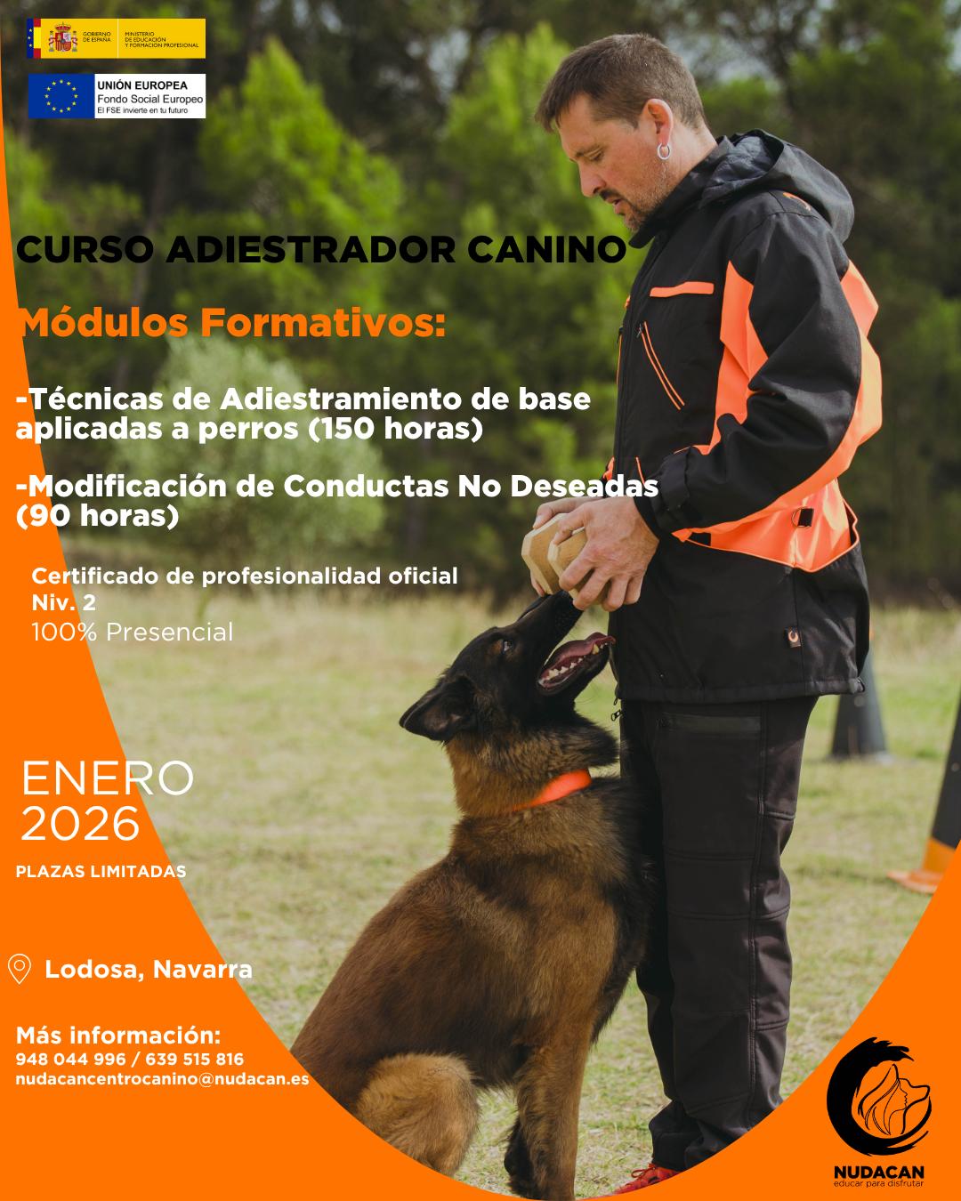 En Nudacan y debido a la demanda del sector, hemos acreditado nuestro centro, profesorado y contenido para poder impartir la formación de Adiestrador Canino Profesional con la titulación oficial recibiendo el Certificado de Profesionalidad de Adiestramiento de base y educación canina (SEAD0412 – Niv.2), teniendo validez para todo el Estado Español y también a nivel Europeo.